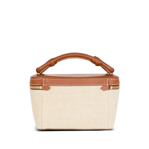 ecru/camel brown cotton-linen blend canvas embroidered logo to the front gold-tone hardware contrasting leather trim two-way zip fastening adjustable shoulder strap single top handle main compartment internal card slot B-Army canvas vanity case