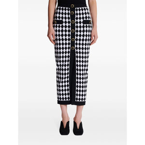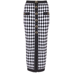 black/white knitted construction diamond pattern patterned intarsia knit decorative button detailing elasticated waistband front slit below-knee length straight hem Buttoned midi skirt Size and Fit - This piece fits true to size. We recommend you get your regular size. Model is 1,75m / 5ft 8in wearing size 36 (FR)