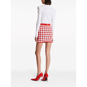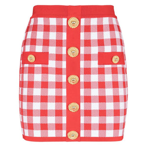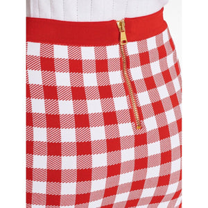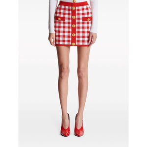 poppy red gingham check pattern decorative button detailing rear zip fastening high waist straight hem two front welt pockets straight hem above-knee length This item contains at least 50% materials which are certified or widely recognised as having a lower environmental impact through production and/or manufacturing processes that reduce water consumption and the use of harmful chemicals, or re-use by-products of the production process. Learn more about what makes a product Conscious on our Conscious Criteria page. Vichy buttoned mini skirt Size and Fit - This piece fits true to size. We recommend you get your regular size. Model is 1,75m / 5ft 8in wearing size 36 (FR)