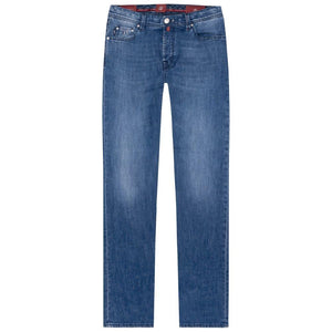بنطلون جينز رجالي من تراماروسا هوت كوتور مصنوع من القطن المرن قليلاً، بقصّة عادية، وخمسة جيوب، وملصق من جلد سويدي أزرق مع شعار على الظهر