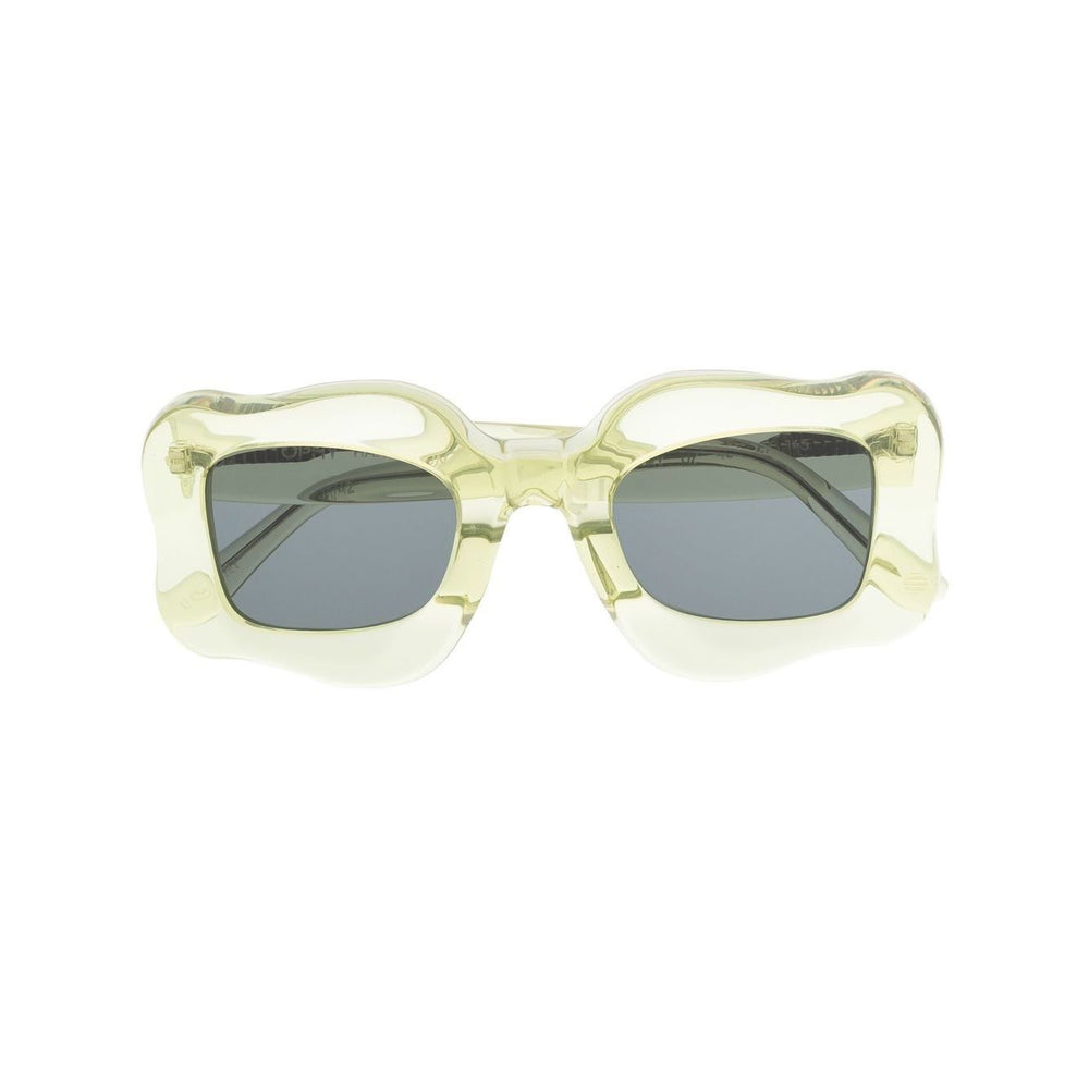 oversized curved-frame sunglasses from Bonsai featuring green tea, transparent design, oversize frame, curved corners, tinted lenses, logo print at the arm and straight arms. These glasses come with a protective case.. Happy sunglasses Size and Fit - Arm Length: 14.5 Centimetres. Bridge Width: 2.7 Centimetres. Lens Diameter: 4.8 Centimetres. Total Width: 13.5 Centimetres.