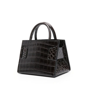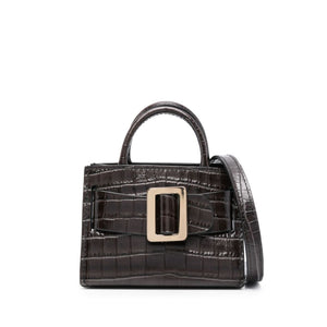 Borsa nero, in pelle di vitello, grana liscia, effetto coccodrillo in rilievo, fibbia con logo inciso, chiusura con cinturino con fibbia, cinturino da polso staccabile, due manici superiori arrotolati, tracolla staccabile, scomparto principale e fodera in pelle scamosciata. Bobby Charm leather mini bag Size and Fit - Width 4,13 in / 10,5 cm