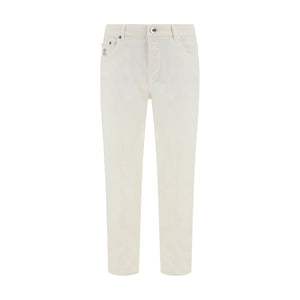 Brunello Cucinelli’s cotton Jeans are a timeless and versatile piece with a classic five-pocket design. The front button closure and belt loops at the waistband allow for a comfortable and adjustable fit. The distinctive detail is the iconic leather patch with the brand’s signature press-stamped signature, applied to the back, which adds a touch of understated elegance. The embroidered logo on the front breast pocket and turn-up hem complete the design, giving it a refined, polished look.