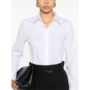 white cotton blend poplin texture pointed flat collar signature Monili chain detail long sleeves buttoned cuffs curved hem concealed front button fastening Cotton shirt Size and Fit - This piece fits true to size. We recommend you get your regular size. Model is 1,75m / 5ft 8in wearing size S