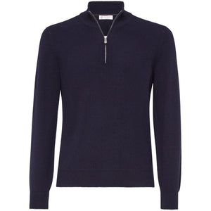 Navy blue cashmere knitted construction funnel neck short front zip fastening long sleeves ribbed cuffs and hem straight hem Cashmere high-neck sweater