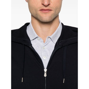 Blue, classic hood, front zip fastening, long sleeves, side slit pockets, ribbed cuffs and hem. Cotton zipped hoodie