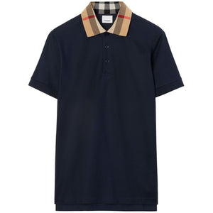 navy blue cotton jersey knit Vintage Check pattern contrasting collar front button placket short sleeves straight hem Check collar cotton polo shirt