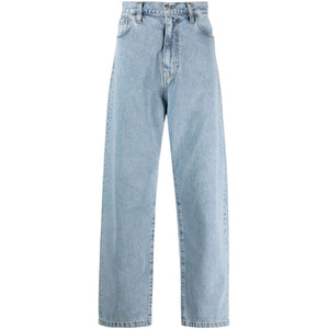light blue cotton blend denim butterfly fastening classic five pockets belt loops wide leg logo patch to the rear Denim cotton jeans Size and Fit - This piece fits true to size. We recommend you get your regular size. Model is 1,84m / 6ft 1in wearing size 32 (WAIST CM)