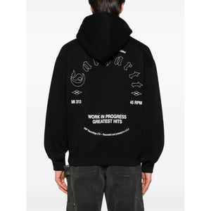 black front pouch pocket drawstring hood ribbed cuffs and hem logo print to the front Greatest Hits hoodie Size and Fit - This piece fits true to size. We recommend you get your regular size. Model is 1,84m / 6ft 1in wearing size M