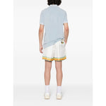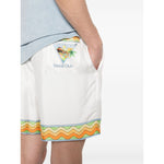 white/multicolour silk twill weave elasticated waistband two side slash pockets rear patch pocket contrasting border Afro Cubism Tennis Club print detail at the rear pocket and border drawstring waist Drawstring silk shorts Size and Fit - This piece fits true to size. We recommend you get your regular size. Model is 1,84m / 6ft 1in wearing size M