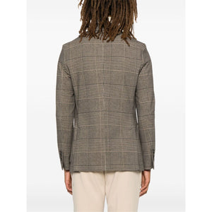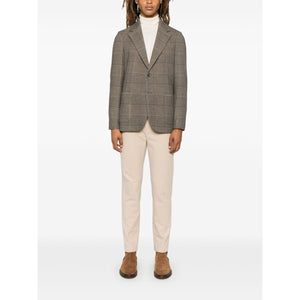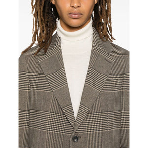 light brown/black cotton blend fleece texture Prince of Wales check pattern front button fastening notched lapels long sleeves faux-buttoned cuffs chest welt pocket dart detailing two front patch pockets English rear vents internal jetted pocket partial lining curved hem Cotton single-breasted jacket Size and Fit - This piece fits true to size. We recommend you get your regular size. Model is 1,84m / 6ft 1in wearing size 48 (IT)