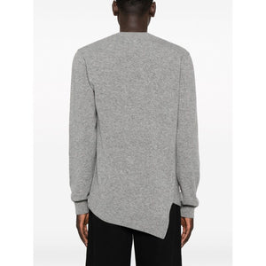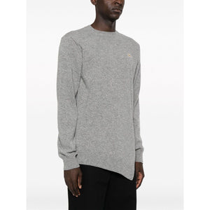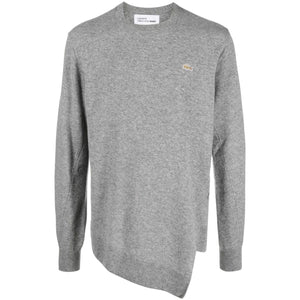 X Lacoste asymmetric hem wool jumper from COMME DES GARÇONS SHIRT featuring light grey, wool, knitted construction, logo patch at the chest, round neck, asymmetric hem and ribbed cuffs and hem. Wool sweater Size and Fit - This piece fits true to size. We recommend you get your regular size. Model is 1,84m / 6ft 1in wearing size M