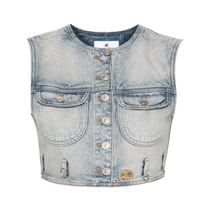 light blue cotton washed denim round neck sleeveless two button-fastening chest pockets signature AC logo embroidery belt loops straight hem front button fastening with logo-embossed buttons Denim cropped vest Size and Fit - This piece fits true to size. We recommend you get your regular size. Model is 1,75m / 5ft 8in wearing size 36 (FR)