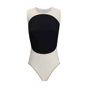 Courrèges’ satin illusion hoop Bodysuit is an iconic and bold garment that plays with transparencies and textural contrasts for a striking effect. The sleeveless design in sheer tulle wraps the silhouette lightly, while the round neckline adds a touch of essentiality. Taking center stage, the satin circle applied on the front creates a refined “illusion” effect, a distinctive signature of Courrèges style. The closure on the brief with buttons ensures practicality without compromising elegance. A statement garment, perfect for those who like to stand out with class and originality.