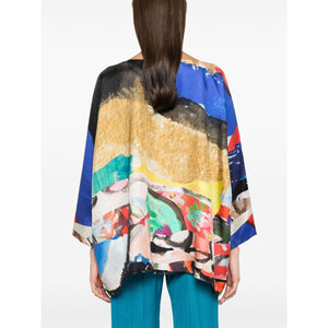 blue/multicolour silk abstract pattern print round neck long sleeves straight hem Printed silk blouse Size and Fit - This piece fits true to size. We recommend you get your regular size. Model is 1,75m / 5ft 8in wearing size UNI