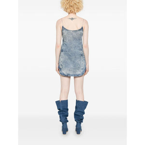 cerulean blue concealed side hook and zip fastening spaghetti straps sleeveless frayed detailing Denim print mini dress Size and Fit - This piece fits true to size. We recommend you get your regular size. Model is 1,75m / 5ft 8in wearing size S