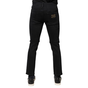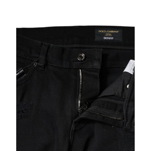 Dolce & Gabbana Black Cotton Tattered Skinny Denim Logo Jeans