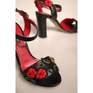 Dolce & Gabbana Black Embossed Carnation Heeled Sandals Shoes