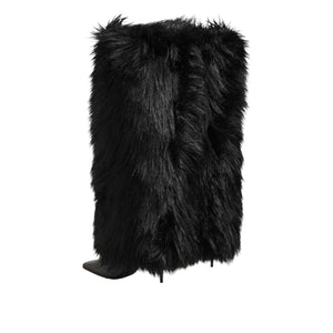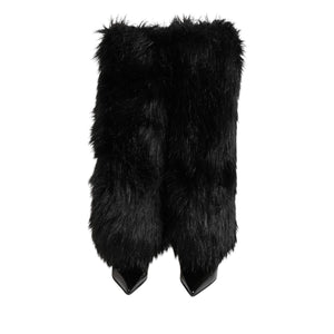 Dolce & Gabbana Black Faux Fur Pointed Knee High Stiletto Boots Shoes