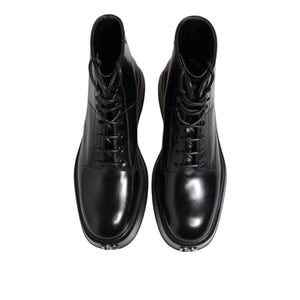 Dolce & Gabbana Black Leather Logo Ankle Boots Lace Up Shoes