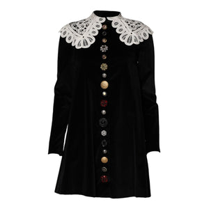 Gorgeous brand new, 100% Authentic Dolce & Gabbana black velvet dress featuring a distinctive white lace collar and a row of assorted decorative buttons down the front. Lace collar velvet dress. This style incorporates a vintage aesthetic with its high neck and Peter Pan-style lace collar.