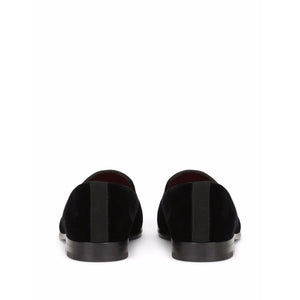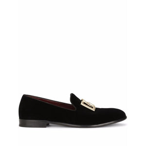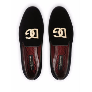 Black cotton velvet DG-plaque velvet slippers from DOLCE & GABBANA featuring gold-tone logo lettering, almond, slip-on style, silk lining, branded insole and flat leather sole. Logo velvet loafers Size and Fit - Heel 0,6 in / 1,5 cm