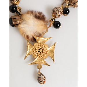 Gorgeous brand new with tags, 100% Authentic Dolce & Gabbana featuring a bold Maltese cross pendant with leopard-print enamel detailing, accented by black resin beads, gold-tone hardware, and soft fur pom-poms for a luxurious touch. The intricate mix of textures and prints makes this necklace a true collector’s piece, perfect for elevating any look with signature Dolce & Gabbana opulence.