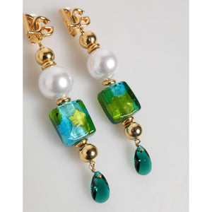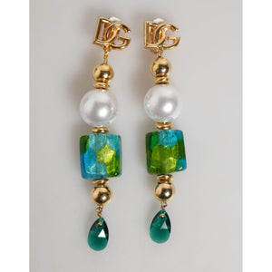 Dolce & Gabbana Gold Brass Multicolour Pearl Green Blue Drop Logo DG Earrings