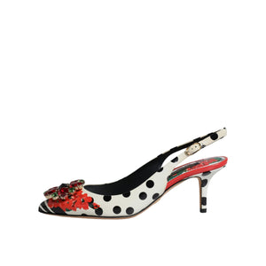 Gorgeous 100% Authentic Dolce & Gabbana leather slingback heels pumps with polka dots and floral print and crystal embellishment.