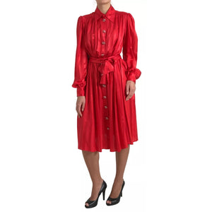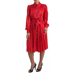 • Dolce & Gabbana Red Button Down Belted Midi Satin Silk Dress