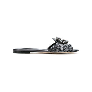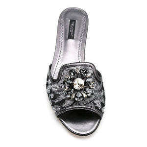 Dark silver Bianca crystal-embellished lace sandals from Dolce & Gabbana featuring a floral lace pattern, crystal embellishments, an open toe, a branded insole and a slip-on style. Rainbow flat lace sandals Size and Fit - Heel 0,6 in / 1,5 cm