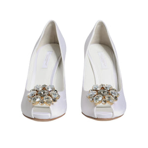 Dolce & Gabbana White Crystals Peep Toe Satin Pumps Shoes