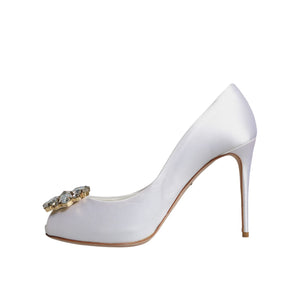 Dolce & Gabbana White Crystals Peep Toe Satin Pumps Shoes