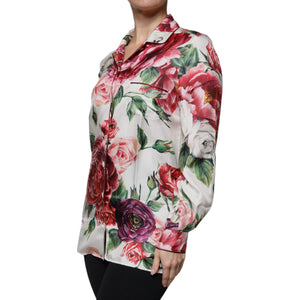 Dolce & Gabbana White Peony Silk Long Sleeves Collared Blouse Top
