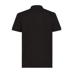قميص بولو أسود من القطن بياقة قصيرة وأزرار أمامية للإغلاق وشعار على الصدر وأكمام قصيرة وحاشية مستقيمة المقاس والملاءمة - هذه القطعة تناسب المقاس الحقيقي. نوصيك بالحصول على مقاسك المعتاد. يبلغ طول الموديل 1.84 متر / 6 أقدام و1 بوصة وترتدي المقاس M