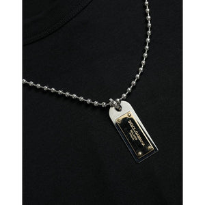 استمتع بالأناقة الخالدة مع تي شيرت القطن الأسود الفاخر الذي نقدمه لك من Dolce & Gabbana الشهير. تتميز هذه القطعة المذهلة بفتحة رقبة مستديرة كلاسيكية ومميزة بسلسلة فريدة من نوعها باللونين الفضي والذهبي، مما يضيف لمسة من الرقي إلى خزانة ملابسك الكاجوال. مصنوع من القطن بنسبة 100%، هذا التي شيرت يوفر الراحة والملاءمة العادية، مما يجعله إضافة متعددة الاستخدامات إلى مجموعتك. يتم تصنيع كل قطعة بدقة في إيطاليا، مما يضمن أعلى مستويات الجودة والاهتمام بالتفاصيل.