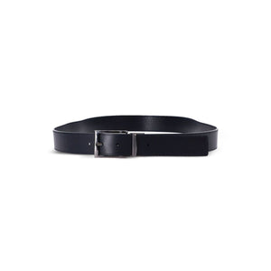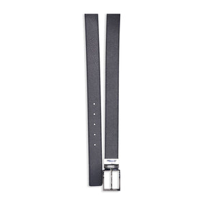 Black leather grained texture buckle fastening engraved logo punched holes silver-tone hardware. Leather reversible belt