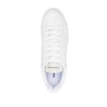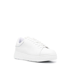 leather low-top sneakers from EMPORIO ARMANI featuring white, calf leather, grained texture, logo patch at the tongue, round toe, front lace-up fastening, branded insole and ridged rubber sole. When buying this unisex item, keep in mind that it is graded in standard men's sizing.. Leather sneakers Size and Fit - Heel 1,6 in / 4 cm; Platform 1 in / 2,5 cm.
