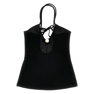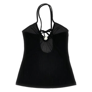 Top with V-neck embellished with a logo ring detail and crossed shoulder straps on the back. A garment with a luminous touch thanks to the lurex filaments present in the fabric. Sleeveless top Size and Fit - This piece fits true to size. We recommend you get your regular size. Model is 1,75m / 5ft 8in wearing size S