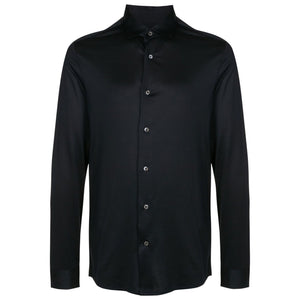 navy blue cotton-lyocell blend straight-point collar front button fastening long sleeves buttoned cuffs curved hem Cotton blend shirt