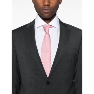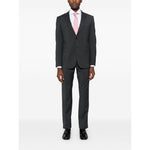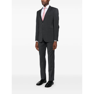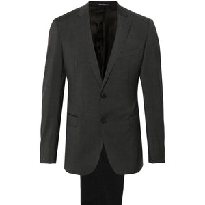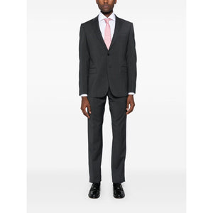medium grey virgin wool mélange effect Blazer: notched lapels shoulder pads long sleeves faux buttoned cuffs chest welt pocket two front flap pockets English rear vents multiple internal slip pockets full lining front button fastening Trousers: belt loops pressed crease two diagonal pockets to the sides two rear button-fastening jetted pockets concealed front button, hook and zip fastening Wool single-breasted suit