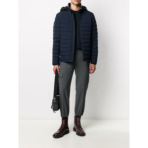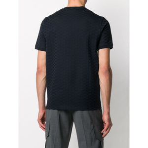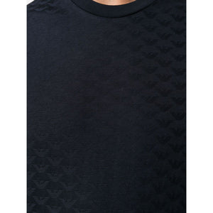 Cotone blu navy, stampa logo in rilievo su tutta la superficie, girocollo, maniche corte, orlo dritto. Logo cotton t-shirt