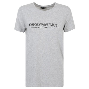 Gray t-shirt, short sleeves, crew neck, EMPORIO ARMANI logo, straight hem. Logo cotton t-shirt Size and Fit - This piece fits true to size. We recommend you get your regular size. Model is 1,75m / 5ft 8in wearing size S