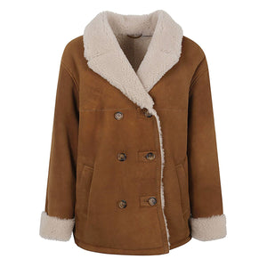 Camel colour, made of leather, lapels with contrasting fur, long sleeves with cuff, double-breasted front closure, two side welt pockets, decorative contrast stitching, inner fur, straight hem. Florentina leather jacket Size and Fit - This piece fits true to size. We recommend you get your regular size. Model is 1,75m / 5ft 8in wearing size 36 (FR)