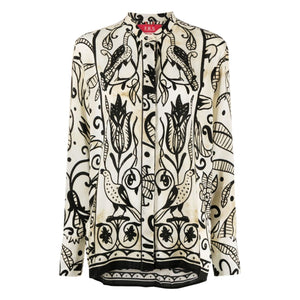 floral-print silk pyjama shirt from F.R.S For Restless Sleepers featuring light beige, black, silk, all-over floral print, band collar, long sleeves and front button fastening. Printed silk shirt Size and Fit - This piece fits true to size. We recommend you get your regular size. Model is 1,75m / 5ft 8in wearing size S