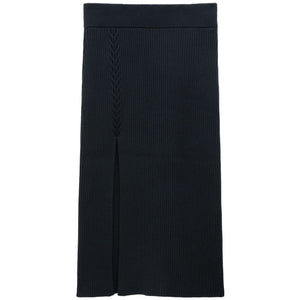 black organic cotton ribbed knit front slit elasticated waistband mid-length straight hem This item is made from at least 50% organic materials. Learn more about what makes a product Conscious on our Conscious Criteria page Cable knit asymmetrical skirt Size and Fit - This piece fits true to size. We recommend you get your regular size. Model is 1,75m / 5ft 8in wearing size S