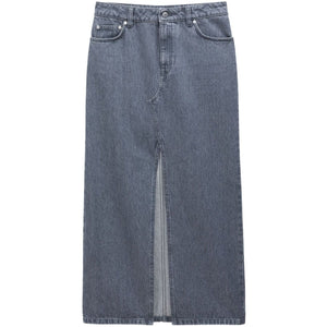 grey organic cotton denim appliqué logo front slit belt loops front button fastening classic five pockets maxi straight hem This item is made from at least 50% organic materials. Learn more about what makes a product Conscious on our Conscious Criteria page Slit denim long skirt Size and Fit - This piece fits true to size. We recommend you get your regular size. Model is 1,75m / 5ft 8in wearing size 36 (FR)