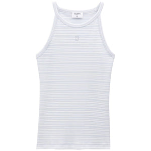 blue-grey/chalk white organic cotton fine ribbed horizontal stripe print embroidered monogram to the front halterneck sleeveless racerback straight hem This item is made from at least 50% organic materials. Learn more about what makes a product Conscious on our Conscious Criteria page Striped tank top Size and Fit - This piece fits true to size. We recommend you get your regular size. Model is 1,75m / 5ft 8in wearing size S