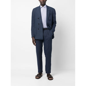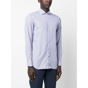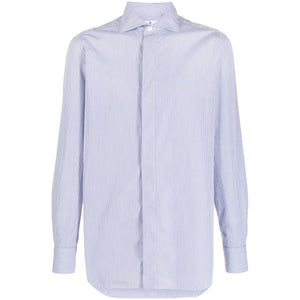 long-sleeve cotton shirt from FINAMORE 1925 NAPOLI featuring blue/white, cotton, vertical stripe pattern, classic collar, concealed front button fastening, long sleeves and curved hem. Regular fit striped cotton shirt Size and Fit - This piece fits true to size. We recommend you get your regular size. Model is 1,84m / 6ft 1in wearing size 39 (COLLAR CM)