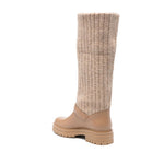 حذاء سهل الارتداء من جلد العجل بلون البيج الصحراوي مع حزام محبوك مضلع وتفاصيل إبزيم مزخرف وأصابع مستديرة ونعل داخلي من الجلد يحمل العلامة التجارية وكعب مكدس بطول الركبة 40 مم ونعل مطاطي يأتي هذا الحذاء مع حقيبة واقية من الغبار. المقاس والملاءمة - كعب 1.6 بوصة / 4 سم